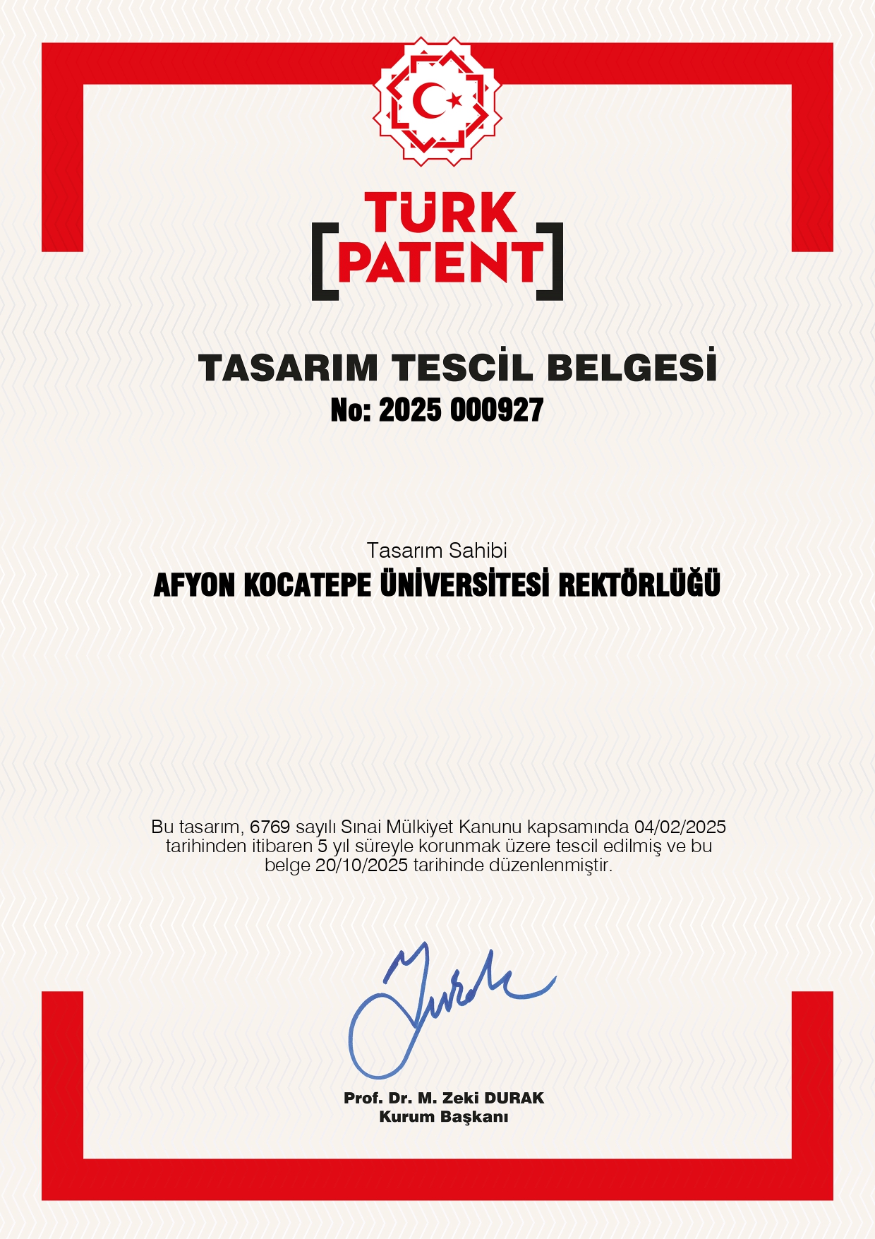 Seramik Bölümümüz Arş. Grv. Dr. Kamuran Ak’ın, tamamlanan “Seramik Hediyelik Eşyaların Bölgesel Turizmin Tanıtımına Katkısı: Frgiya Bölgesel Kültürel Seramik Eşya Tasarımları” başlıklı, BAP 23.KARİYER.02 numaralı projesinin çıktısı olarak gerçekleştirdiği “Tütsülük” tasarımı, Üniversitemiz Teknoloji Transfer Ofisi aracılığıyla, Rektörlüğümüz adına Türk Patent ve Marka Kurumu tarafından tescil edildi.