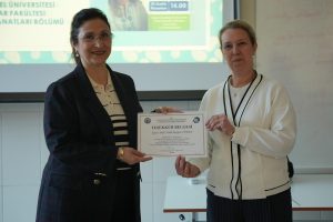 Öğrencilerin kariyer planlamasında net bir hedef belirlemesinin önemli olduğunu, kariyerlerini ilgi ve yetenekleri doğrultusunda şekillendirebileceklerini ifade eden Oyman, öğrencilere mezuniyet sonrasına ilişkin telkin ve tavsiyelerde bulundu. Program, soru-cevap bölümünün ardından Oyman’a, Dekanımız Prof. Dr. Şerife Ebru Okuyucu’nun teşekkür belgesi takdimiyle sona erdi.