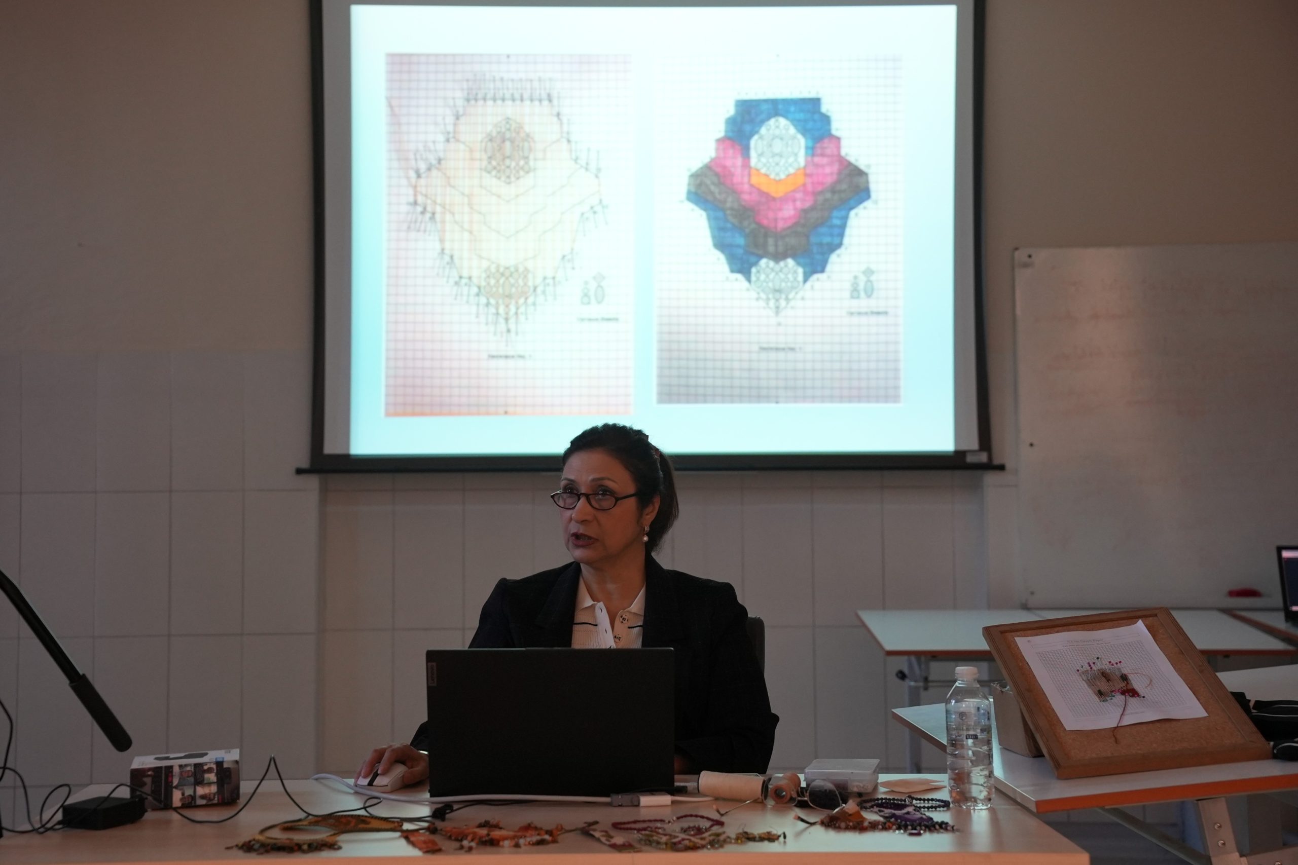 Aynı gün GTS Kulübümüz tarafından da Prof. Naile Rengin Oyman’ın gerçekleştirdiği “İğneli Dokuma Takı Tekniği” konulu atölye çalışması gerçekleştirildi. Öğrencilerin yoğun ilgisiyle düzenlenen etkinlikte, grafik kâğıt üzerinde tasarlanan takının, yarı yumuşak veya köpük bir pano üzerinde iğne ile dokunduğu teknik uygulanmak suretiyle detaylarıyla anlatıldı.