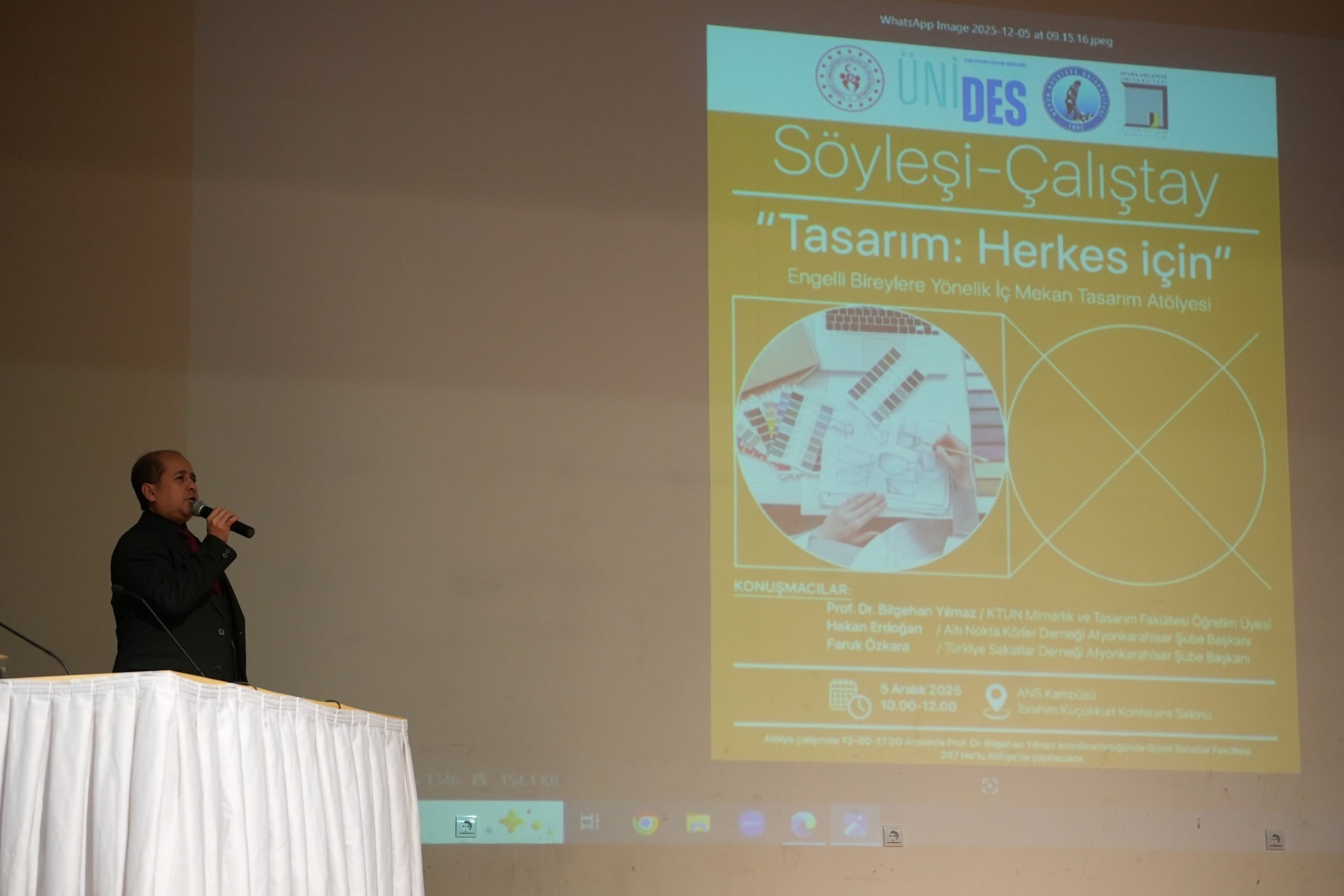 Dekanımızın gerçekleştirdiği açış konuşmasının ardından Konya Teknik Üniversitesi Mimarlık ve Tasarım Fakültesi Öğretim Üyesi Prof. Dr. Bilgehan Yılmaz tarafından “erişilebilirlik, engelliliğin mimari tanımı, evrensel tasarım” gibi konularda kapsamlı bir sunum gerçekleştirildi. Altı Nokta Körler Derneği Afyonkarahisar Şube Başkanı Hakan Erdoğan ve Türkiye Sakatlar Derneği Afyonkarahisar Şube Başkanı Faruk Özkara da katılımcılarla görüş ve önerilerini paylaştılar.