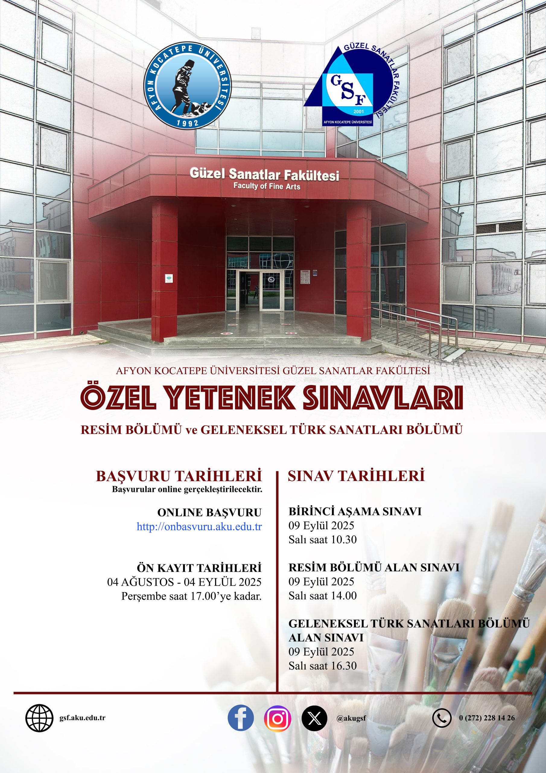 Fakültemiz Geleneksel Türk Sanatları Bölümü ile Resim Bölümüne öğrenci almak üzere 09 Eylül 2025 tarihinde yapılacak “Özel Yetenek Sınavları”nın online başvuruları (Ön Kayıt), 04 Ağustos 2025’te başlayacak.